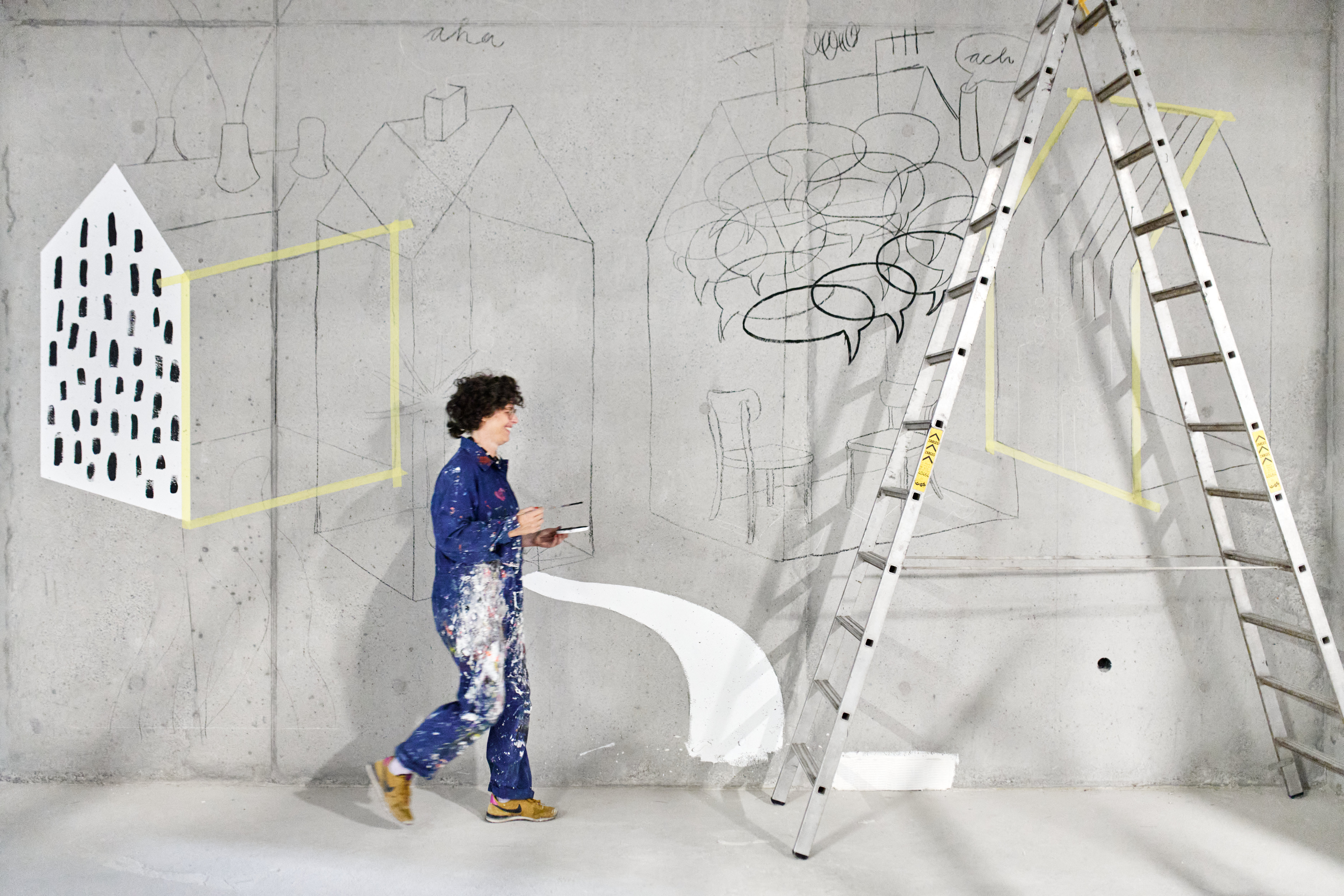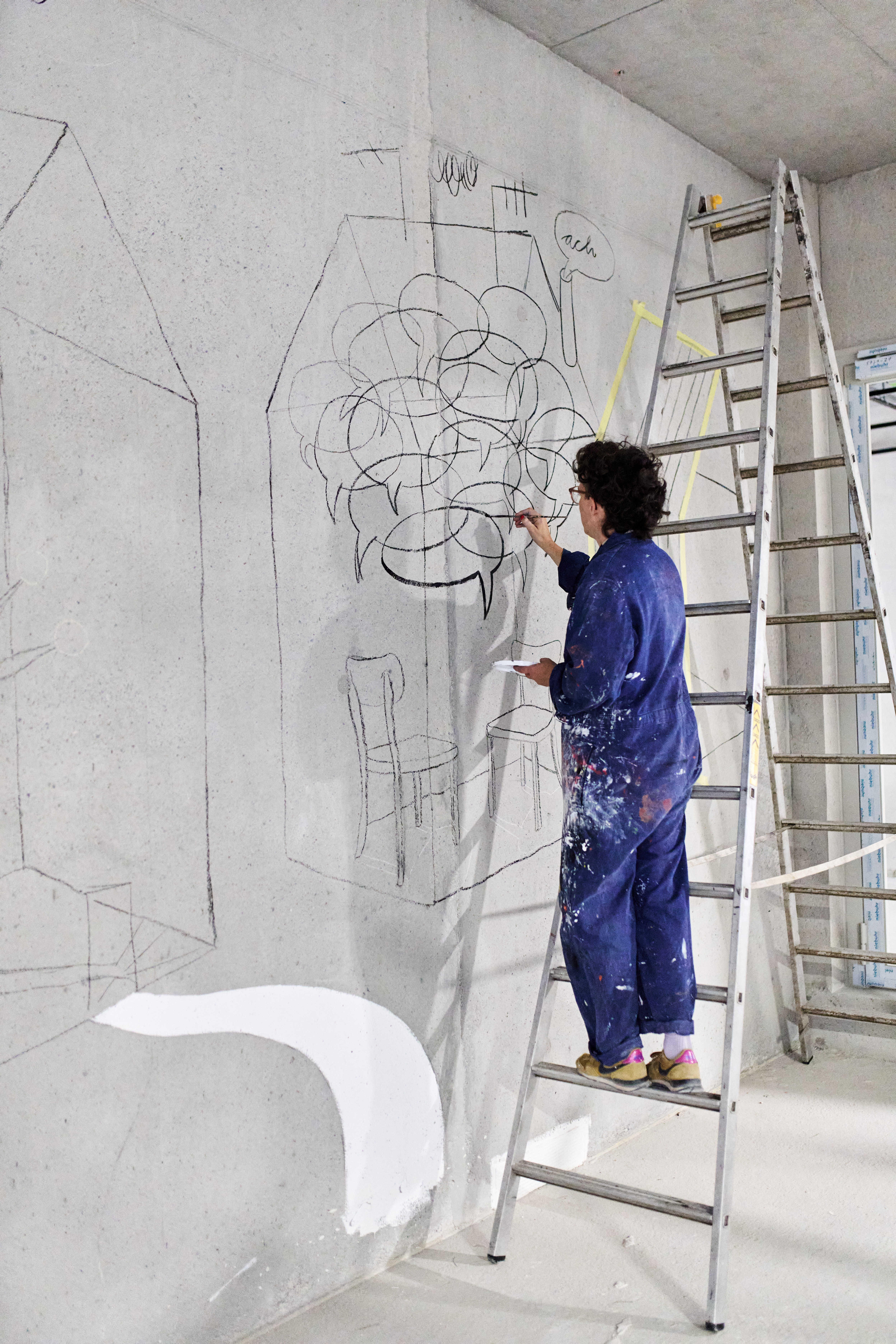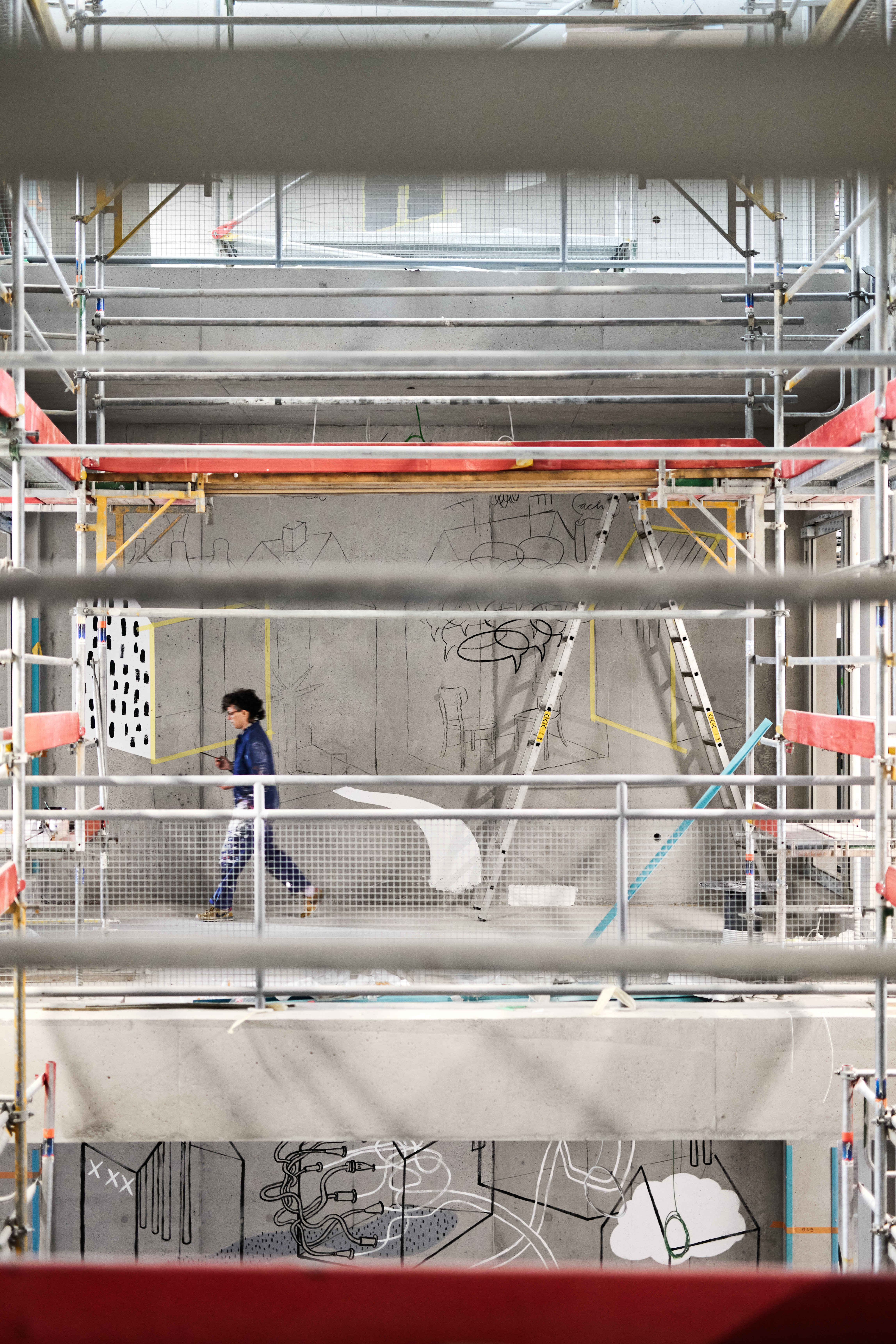 Im Herbst 2024 habe ich meinen Entwurf „Verbindungen“ realisiert. Mit diesem Entwurf hatte ich den Wettbewerb zur Gestaltung des Atriums im Neubau der Hochschule Esslingen gewonnen. Ein Wandgemälde über vier Stockwerke auf fünf gegenüberliegenden Wänden. Die Eröffnung ist für Herbst 2026 geplant. Ein Kunst am Bau-Projekt für den Campus Neue Weststadt, Neubau der Hochschule Esslingen im Auftrag von Vermögen und Bau des Landes Baden-Württemberg.Fotos: Philip Kottlorz
