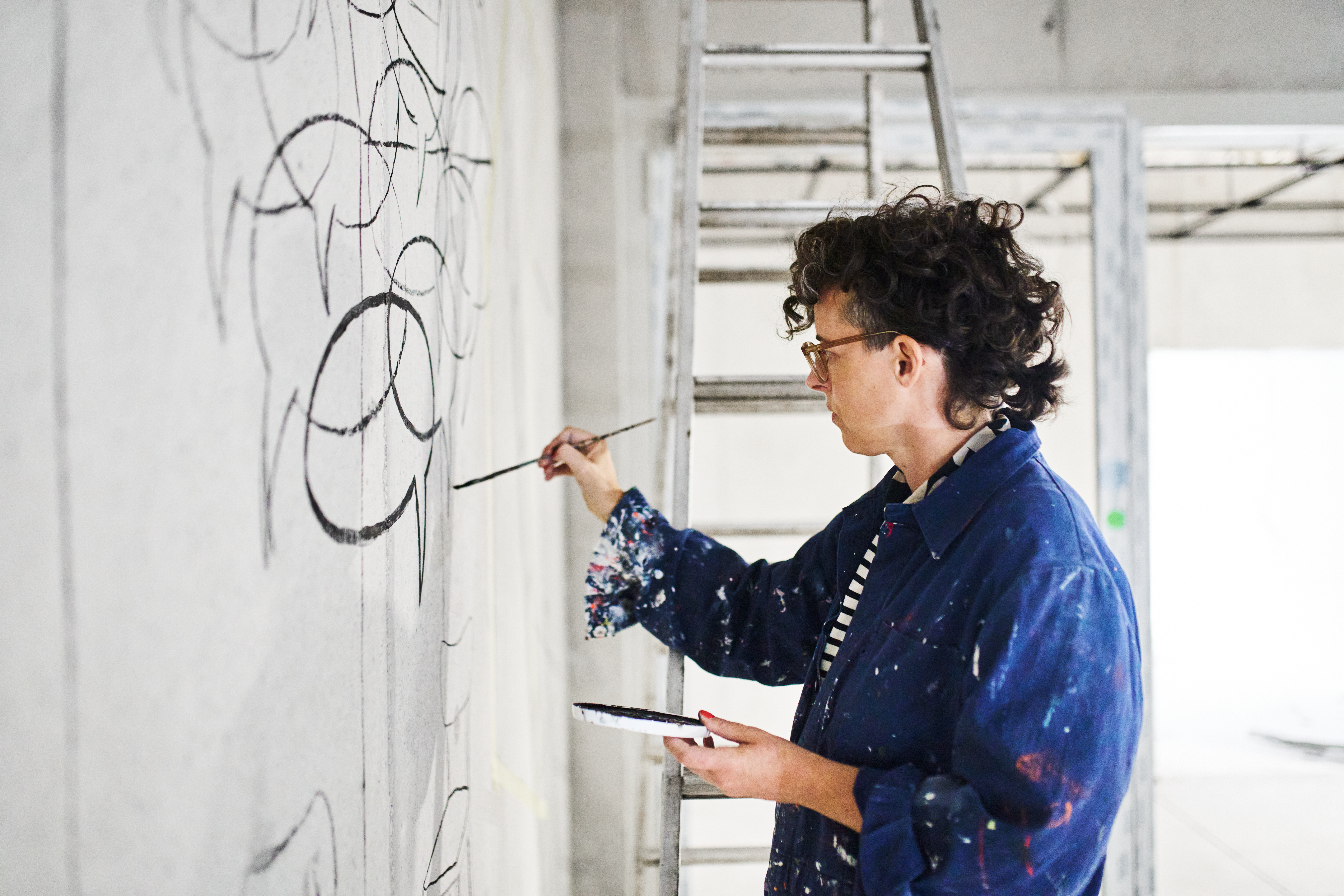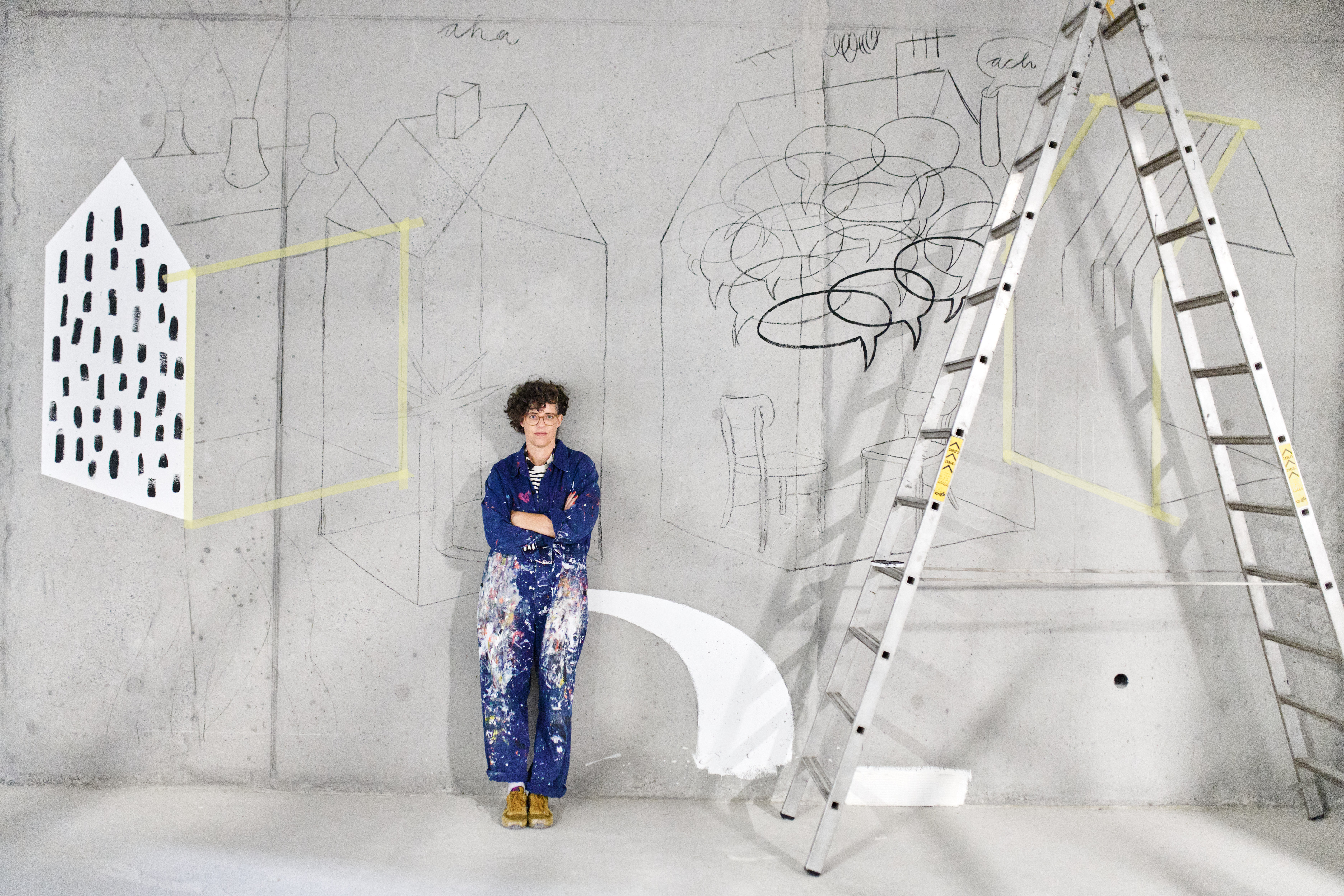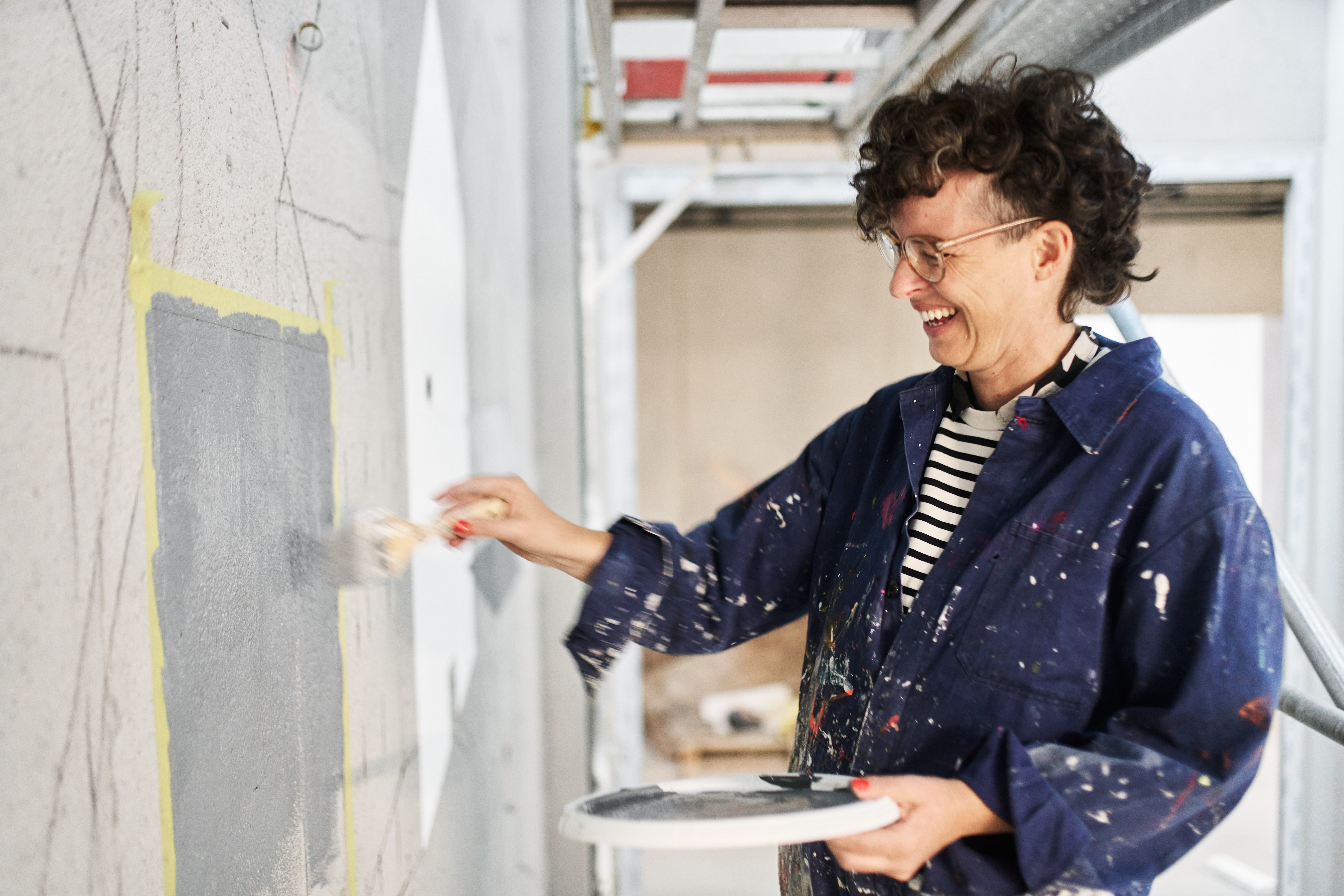 Im Herbst 2024 habe ich meinen Entwurf „Verbindungen“ realisiert. Mit diesem Entwurf hatte ich den Wettbewerb zur Gestaltung des Atriums im Neubau der Hochschule Esslingen gewonnen. Ein Wandgemälde über vier Stockwerke auf fünf gegenüberliegenden Wänden. Die Eröffnung ist für Herbst 2026 geplant. Ein Kunst am Bau-Projekt für den Campus Neue Weststadt, Neubau der Hochschule Esslingen im Auftrag von Vermögen und Bau des Landes Baden-Württemberg.Fotos: Philip Kottlorz